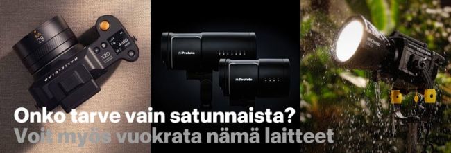 Kaikkia laitteita ei tarvitse aina omistaa. Satunnaiseen tarpeeseen löydät Fimekosta vuokralle Hasselbladin kamerat ja linssit, Profoton salamat ja muokkaimet sekä Godoxin tehokkaat ledivalot. Vuokraan sisältyy aina laitevakuutus.